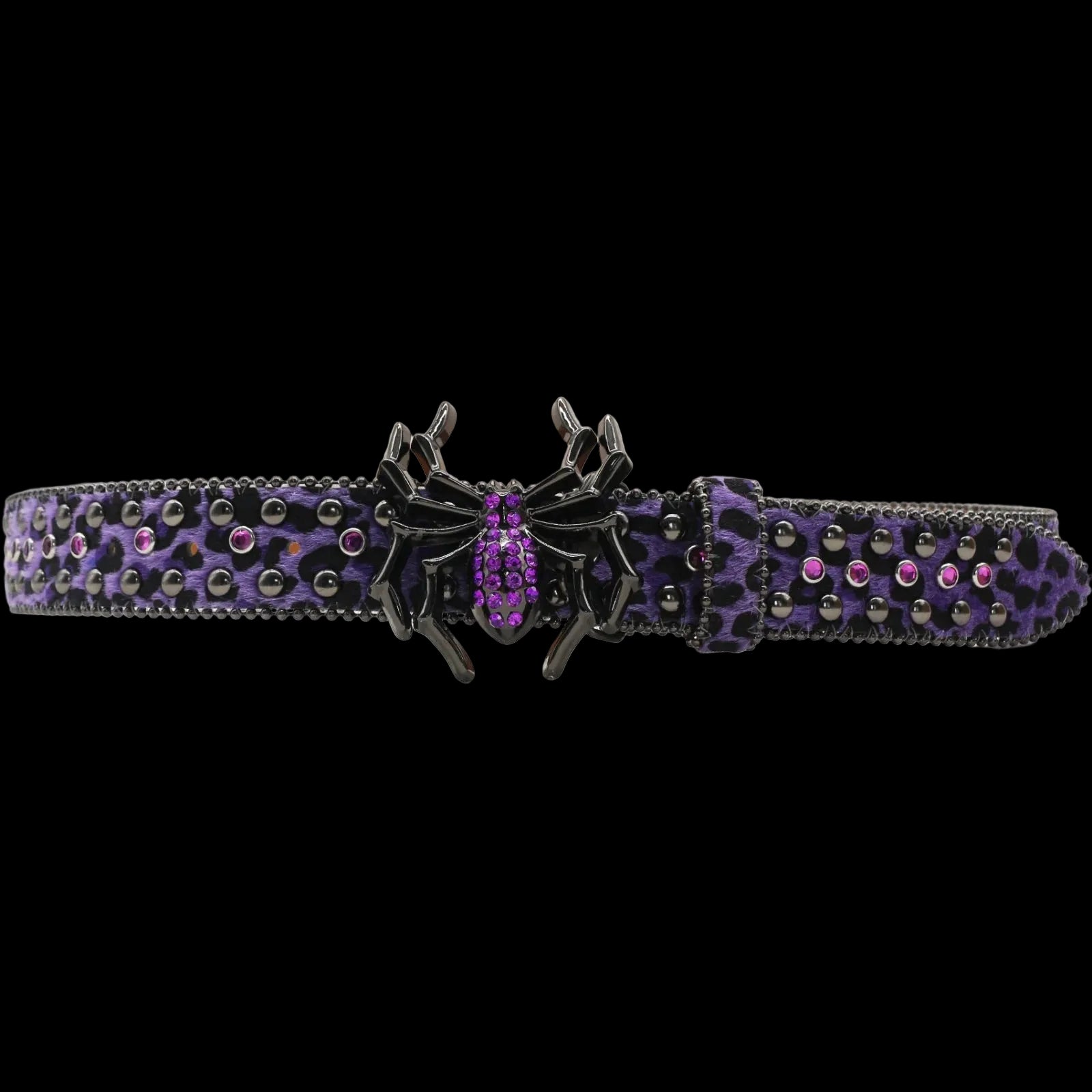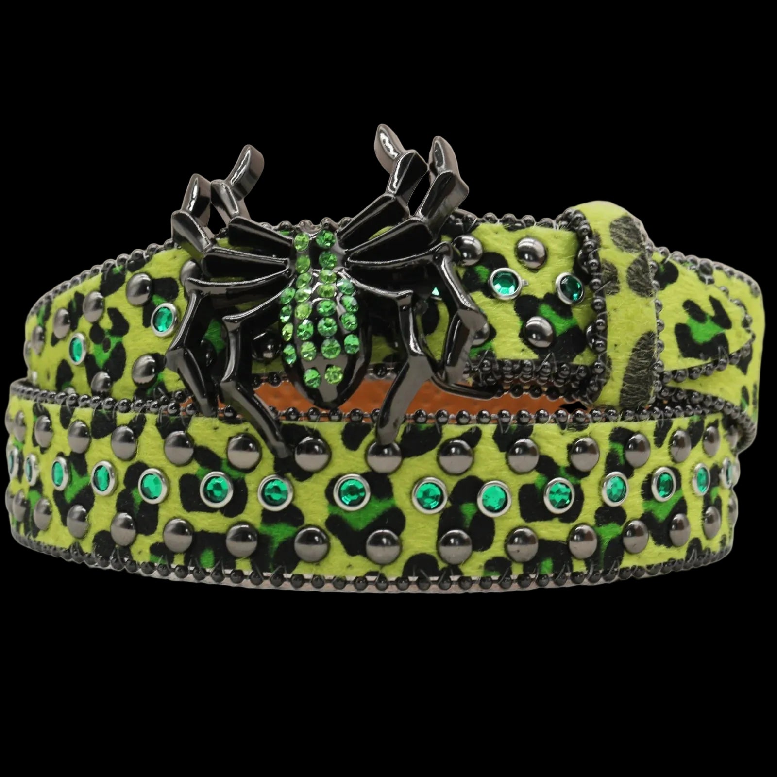 Leopard-print belt with a spider-shaped buckle for a bold, statement accessory. Durable construction with an adjustable fit, perfect for streetwear or layered outfits.